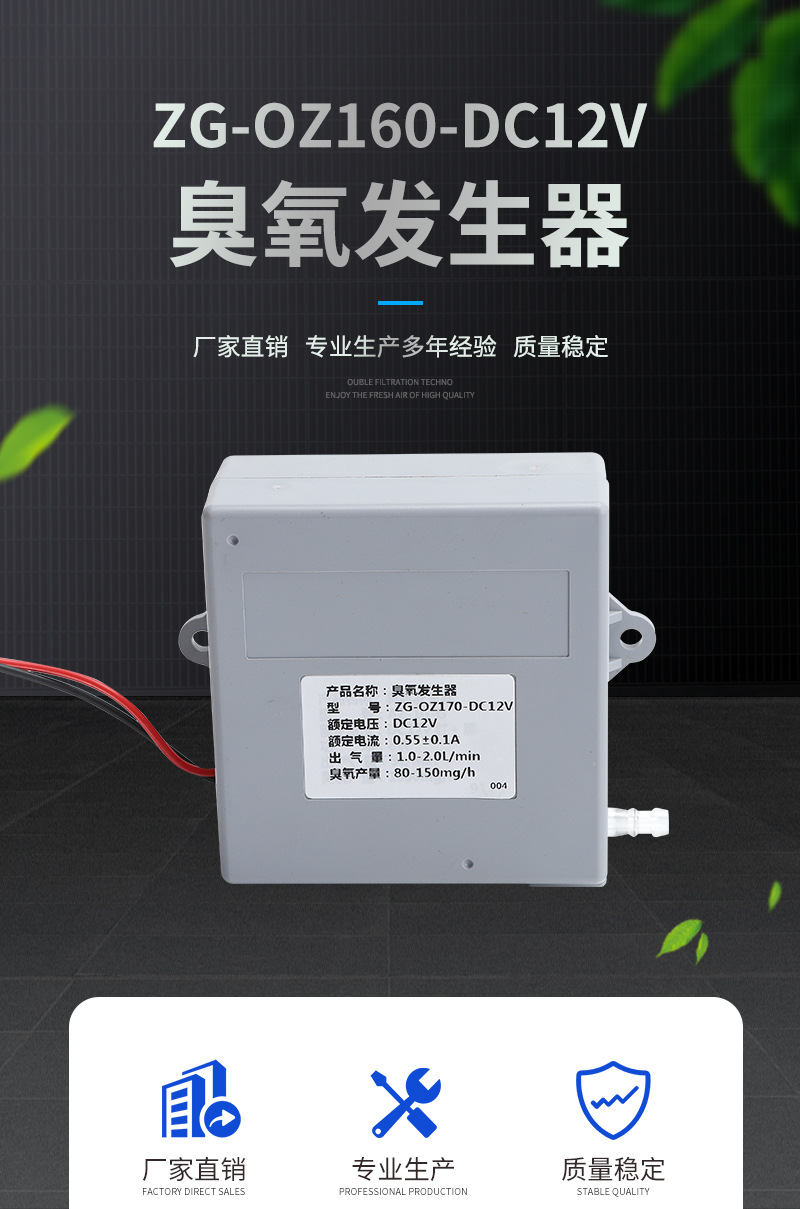 ZG-OZ160-DC12V小型臭氧發(fā)生器采用最新的臭氧核心放電體,包括臭氧發(fā)生管、臭氧驅(qū)動(dòng)電路和氣泵的一體化設(shè)計(jì),只要接上電源即可提供高效穩(wěn)定的臭氧輸出,安裝使用維護(hù)方便。